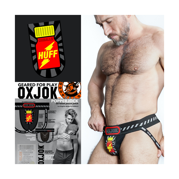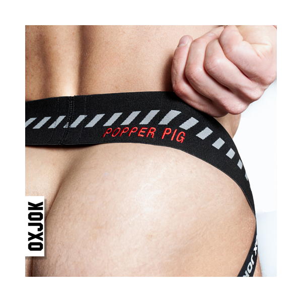 OXJOK POPPERJOCK 3D Rubber Huffer Jock Black is the must-have for all those who want to show off their preferences. The jockstrap comes with a huge Poppers bottle 3D rubber patch on the front and a POPPERS PIG inscription embroidered on the waistband of your right ass cheek – provocative, cheeky and absolutely unmistakable.